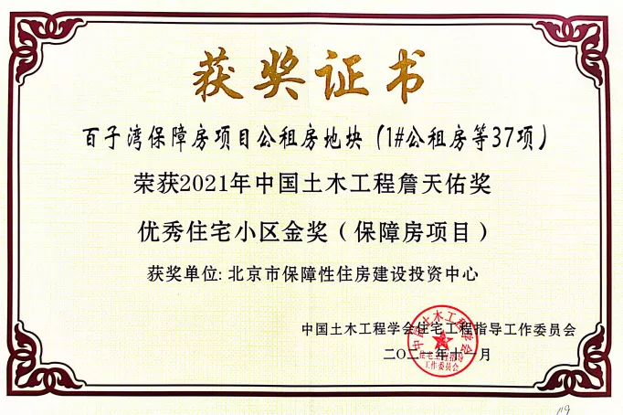 近日,北京保障房中心有限公司所屬百子灣項目、焦化廠項目雙雙獲得2021年中國土木工程詹天佑獎優秀住宅小區金獎。中國土木工程詹天佑獎(Tien-yow Jeme Civil Engineering Prize),由中國土木工程學會和北京詹天佑土木工程科學技術發展基金會聯合設立,是住房和城鄉建設部認定的全國建設系統工程獎勵項目和科技部首批核準的科技獎勵項目,也是中國土木工程領域工程建設項目科技創新的最高榮譽獎。包括百子灣項目、焦化廠項目,共有39個項目榮獲2021年中國土木工程詹天佑獎優秀住宅小區金獎。